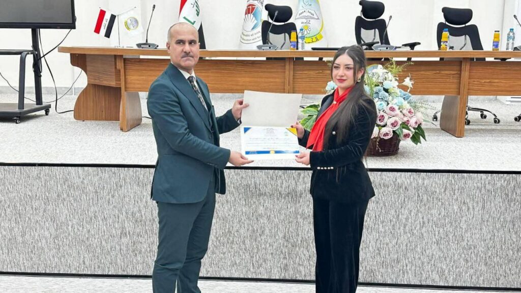At the conclusion of the seminar, and in appreciation of the activity’s success in achieving its awareness and community goals, the Dean of the College of Law, Professor Dr. Anas Mahmoud Khalaf, presented certificates of appreciation to Lieutenant Haneen Bahnam and the administration of the Cultural House, emphasizing the importance of continuing these events that contribute to raising the college’s ranking within community service and sustainable development standards.